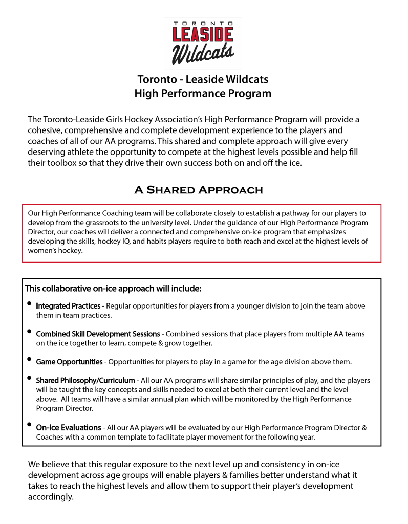 A PDF document to share with the hockey community, communicating the strategy of the High Performance Development stream within the TLGHA.
